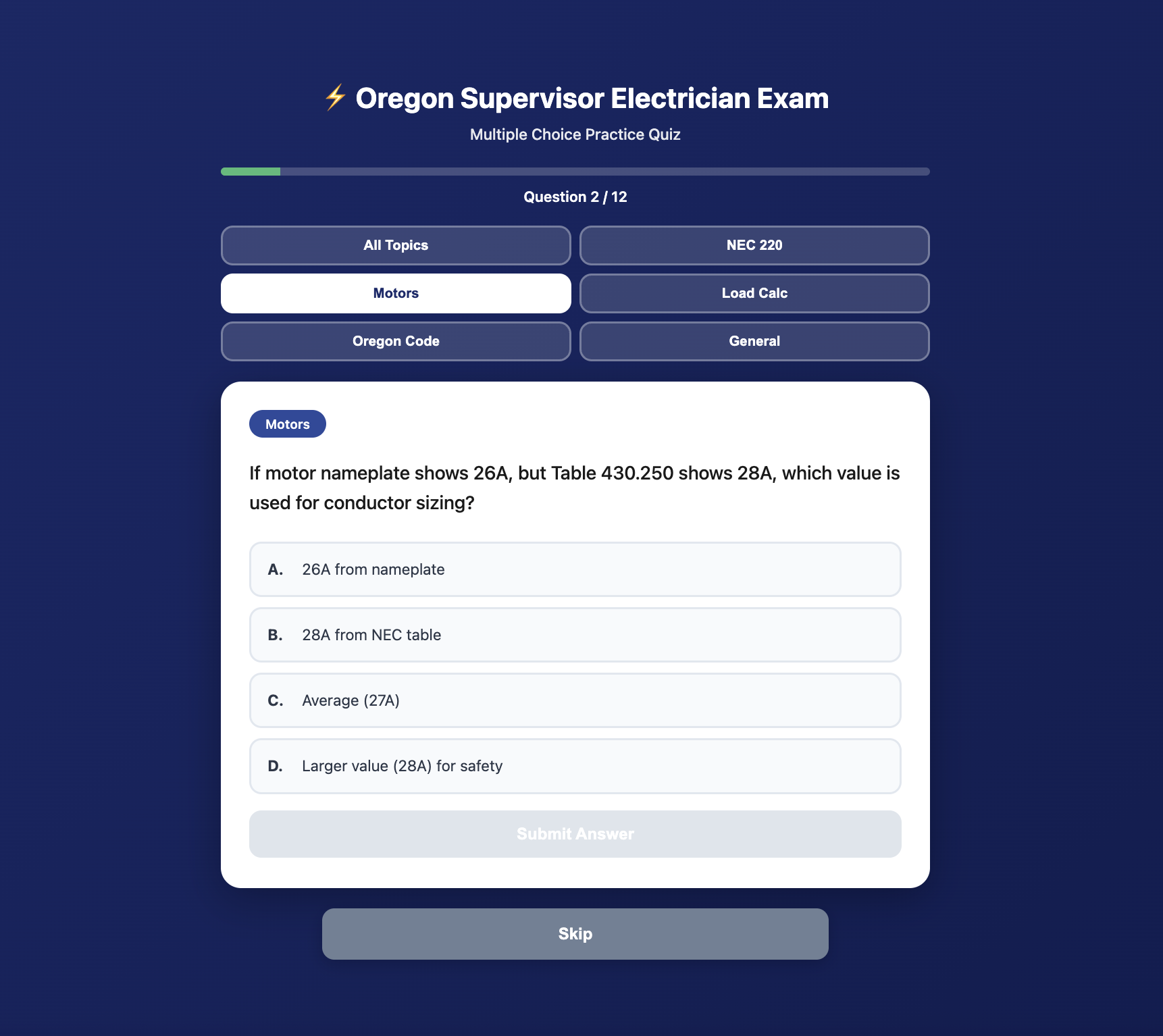 Claude and I developed this prototype for an electrician friend to study for the notoriously hard, Oregon specific, electrician supervisor exam.